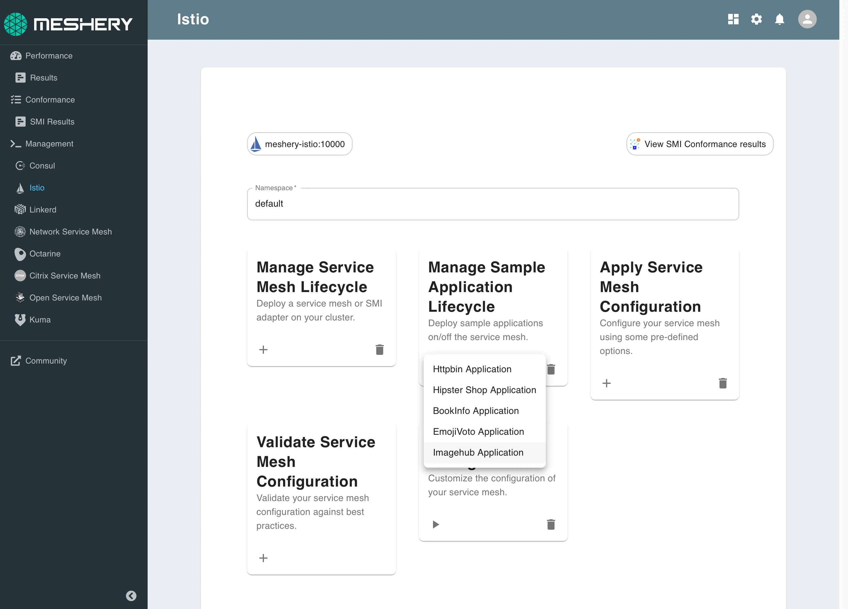 Using Meshery, select Istio from the Management menu.
